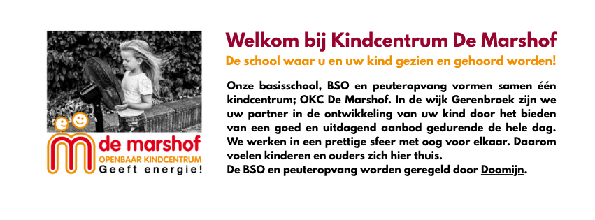 En gaat vooral met plezier naar school en opvang! Op de Marshof worden u en uw kind gezien en gehoord.